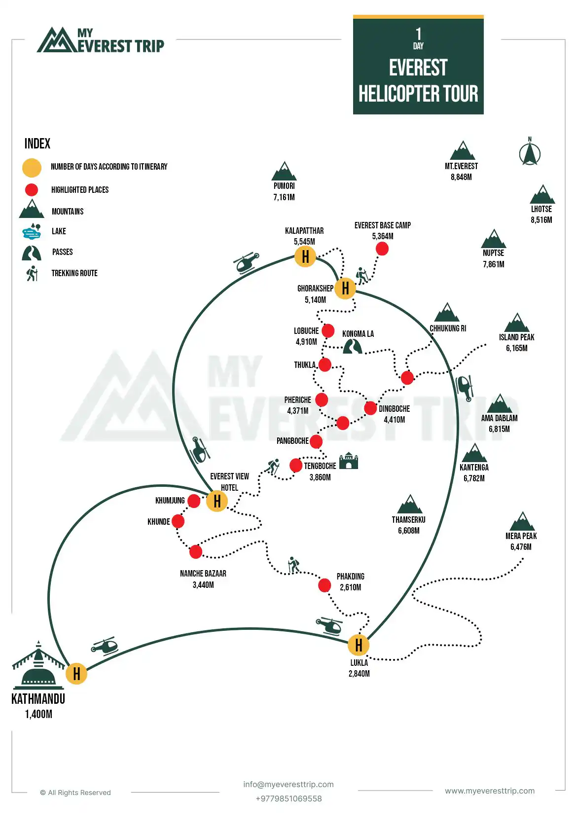 After a beautiful morning, the helicopter lands again in Lukla to refuel and takes you back to Kathmandu. You’ll fly over Phakding, Monjo, and the Dudh Koshi River, bidding farewell to the Himalayan peaks.