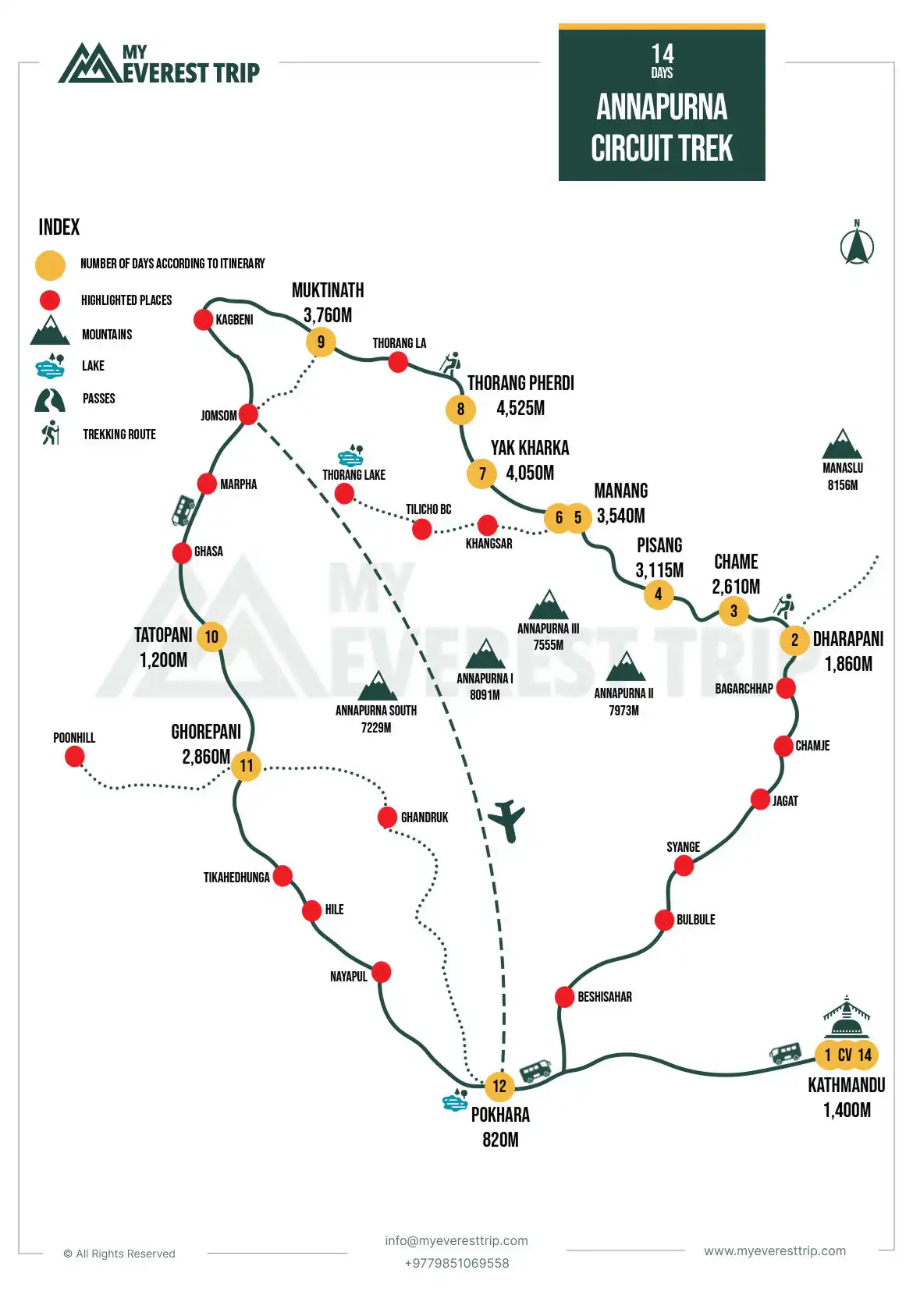 The trek begins upon arrival in Kathmandu and passes through Dharapani, Chame, and Pisang. You continue to Manang, Yak Kharka, and Thorong Phedi before crossing to Muktinath. Then descend to Tatopani, Ghorepani, and Poon Hill, ending in Pokhara and returning to Kathmandu.