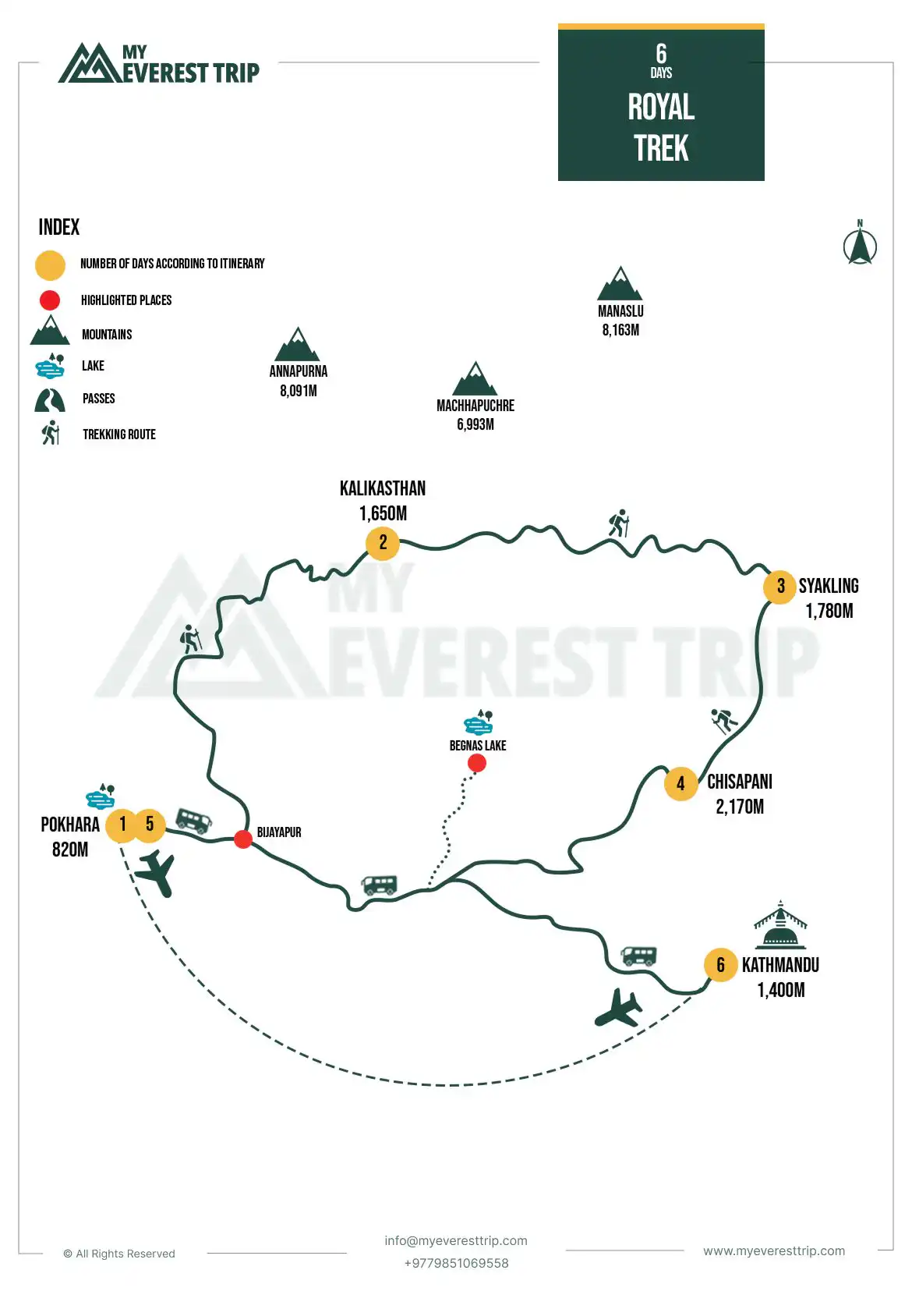 The Royal elevation Syaklung (1730 m) is the highest point during the journey. This is not a very high-altitude trek (like Annapurna Circuit Trek), and altitude sickness is not a big deal here.