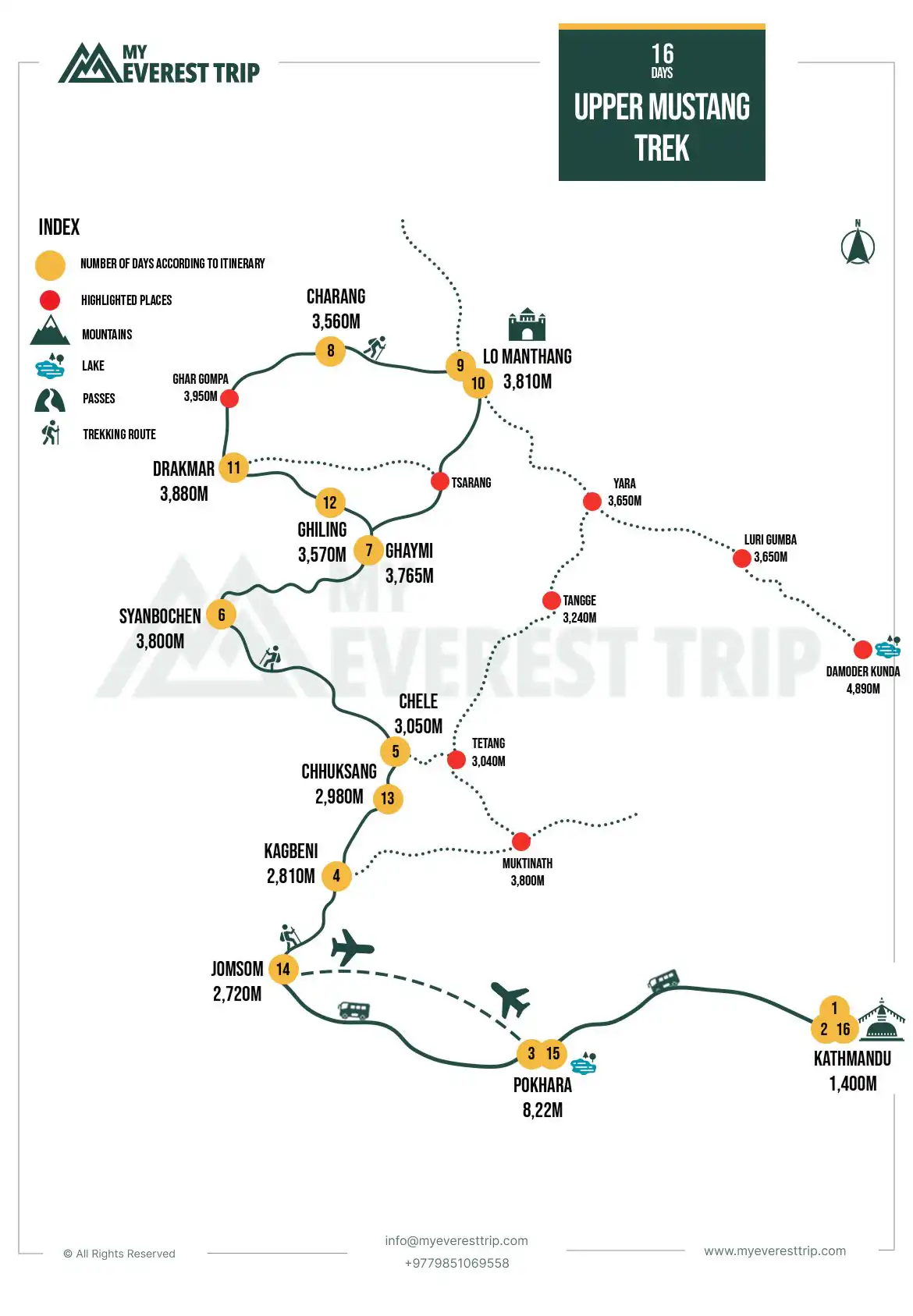 After reaching Jomsom by Flight, your journey begins; as seen on the map, you must trek to contact Kagbeni at an altitude of 2840.